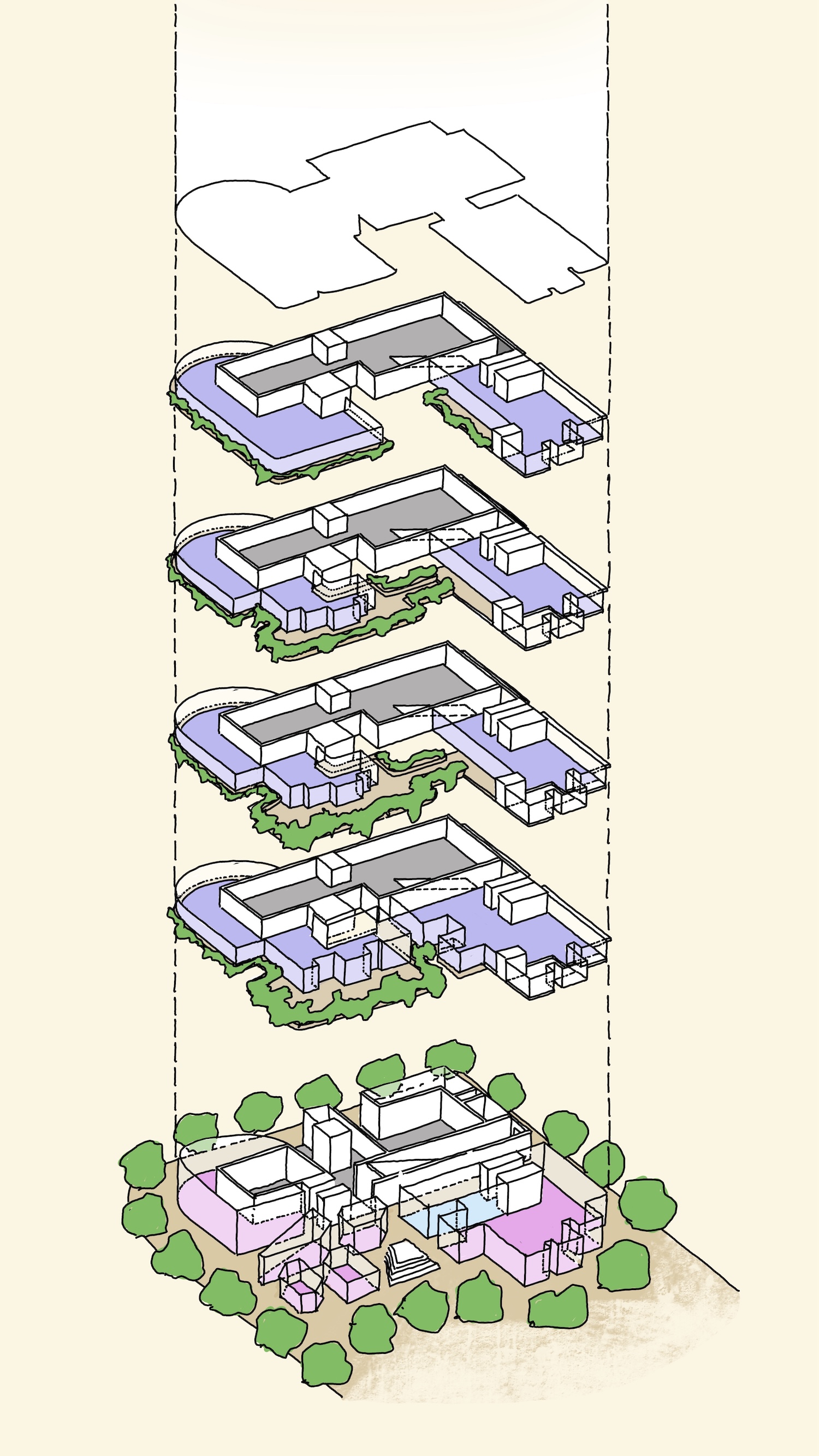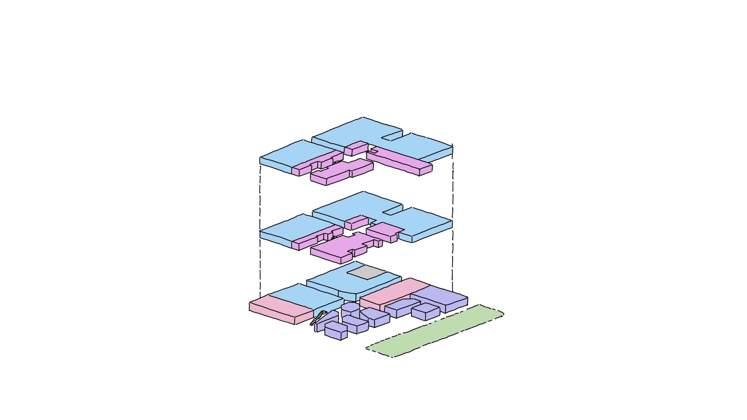exploded isometric of linked podium floors